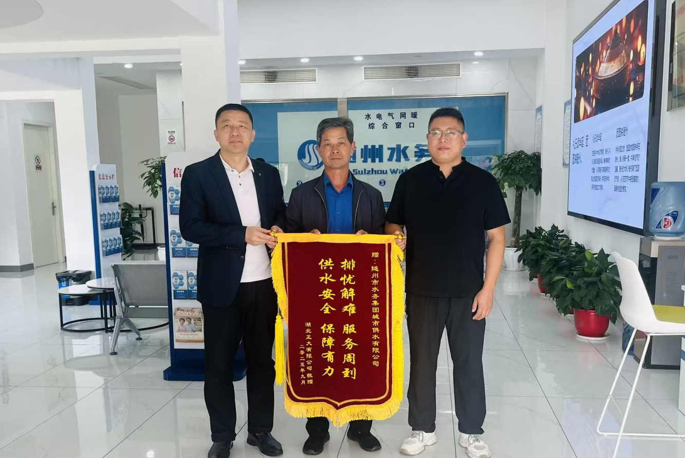一面錦旗,一份認(rèn)可。近日,湖北正大有限公司代表將一面印著“排憂解難 服務(wù)周到 供水安全 保障有力”的錦旗,鄭重送到隨州市水務(wù)集團(tuán)城市供水公司工作人員手中。錦旗上的字跡雖簡,卻滿含企業(yè)對供水服務(wù)的由衷感謝,更成為對隨州水務(wù)人專業(yè)精神與責(zé)任擔(dān)當(dāng)?shù)纳鷦?dòng)褒獎(jiǎng)。
