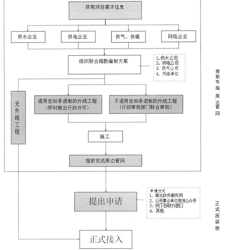 ( 一) 一 口登記早服務。 新建投資項目在土地出讓階段, 隨同填寫《用戶獲得水、電、氣、網(wǎng)、暖需求信息采集單》, 對新建項目施工和生產(chǎn)所需的用水、用電、用氣、用網(wǎng)、用暖 需求進行意向登記。將項目報裝需求通過湖北政務服務網(wǎng)、工 改平臺傳遞給各公用事業(yè)單位,公用事業(yè)單位聯(lián)合上門對接, 根據(jù)用戶需求提前布局項目周邊區(qū)域管網(wǎng),為用戶后續(xù)獲得水、電、氣、網(wǎng)、暖接入作好準備。